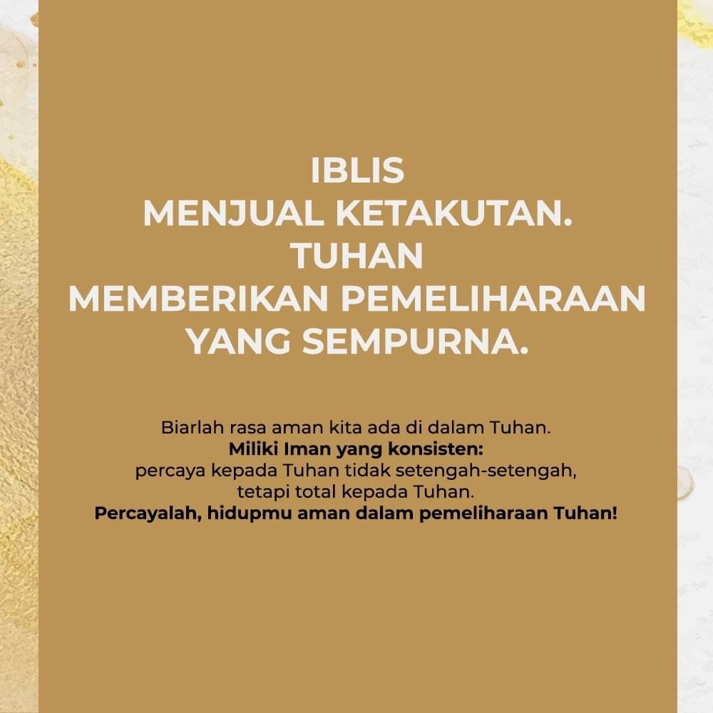 Hari-hari ini iblis sedang menjual ketakutan diantara anak Tuhan. Ketika mereka hidup dalam ketakutan, membeli produk berdasar rasa takut, bukan karena pengertian. Biarlah rasa aman kita ada di dalam Tuhan. Miliki Iman yang konsisten: percaya kepada Tuhan tidak setengah-setengah, tetapi total kepada Tuhan. Percaya bahwa hidupmu aman dalam pemeliharaan Tuhan.